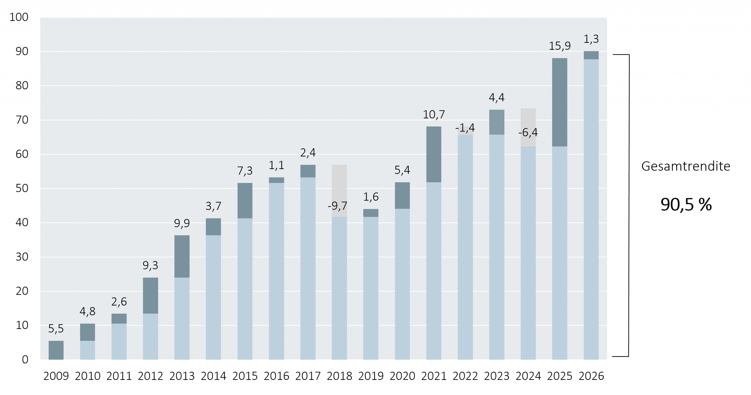 Bisher schloss der Fonds in 14 von 17 Fällen das Jahr mit einer positiven Wertentwicklung ab.